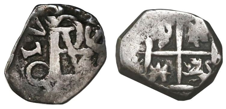 Bogota, Colombia, cob 1/2 real, Charles II (monogram of Philip III or IV), no assayer (Arce?), rare. Restrepo-M54.2; KM-A8; CT-Type 153. 1.64 grams. One of the many idiosyncrasies of the Bogota mint is the fact that all its cob 1/2R used a Philip monogram, even during the long period of 1666-1715 during the reign of Charles II and subsequent uncertainty during the War of Spanish Succession (which may or may not have had anything to do with it), at which time the gold cobs were made with Charles II legends long after his death. The present coin is an excellent example, for the monogram is nearly full but off-center enough to reveal a bold (CAR)OLV(S) in the legend, the other side with good full cross with lions and castles typically transposed, all nicely toned, VF.