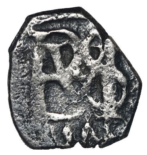 Bogota, Colombia, cob 1/2 real, Philip V, no assayer (1716-1721), proper quadrants. Restrepo-M68.1; S-B12; KM-B8; Cal-Type 60. 1.35 grams. Full monogram with part of king's name and ordinal -PVS V below, choice bottom half of cross (nice castle and lion in proper quadrants) with bold (HISP)ANIARVM in legend, toned and slightly porous XF. Pedigreed to the Gran Colombia collection.
