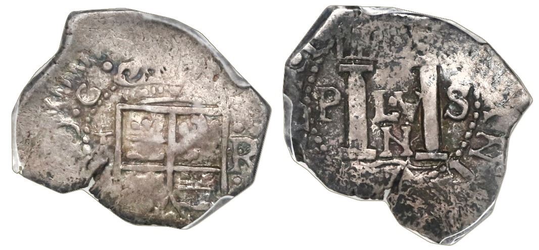 Bogota, Colombia, cob 1 real, Philip IV, assayer R (pillars type, 1651), PCGS XF40, ex-Eldorado. Restrepo-M24.1; S-B7; KM-15; CT-Type 237. 3.02 grams. Bold full assayer to right of nearly full but off-center shield-lions-castles below crown, the full pillars on the other side with motto P-LV-S above mintmark N, rainbow toning, small edge-split. The date is off the flan but attributed to 1651 by the design (according to Restrepo), which is curiously the first date of the pillars type and a whole year earlier than the beginning of the pillars-and-waves type at Potosi (both precipitated by the Potosi mint scandal). Pedigreed to the Eldorado Collection. PCGS #85760945.