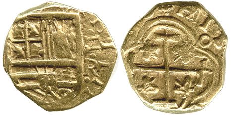 Bogota, Colombia, cob 2 escudos, (165)0R. S-B21; KM-4.1; CT-171. 6.7 grams. Lightly toned VF with full and bold but off-center shield, II-R to right (also king's name), full but off-center cross, bottom of last digit of date visible (the rest inferred by style).