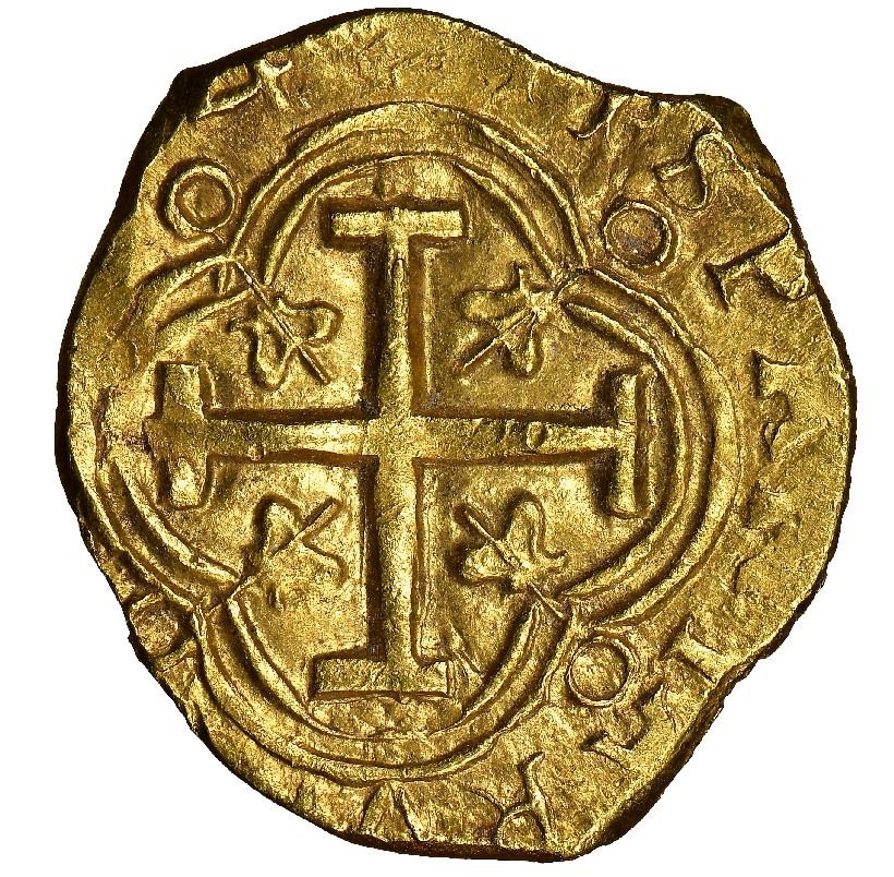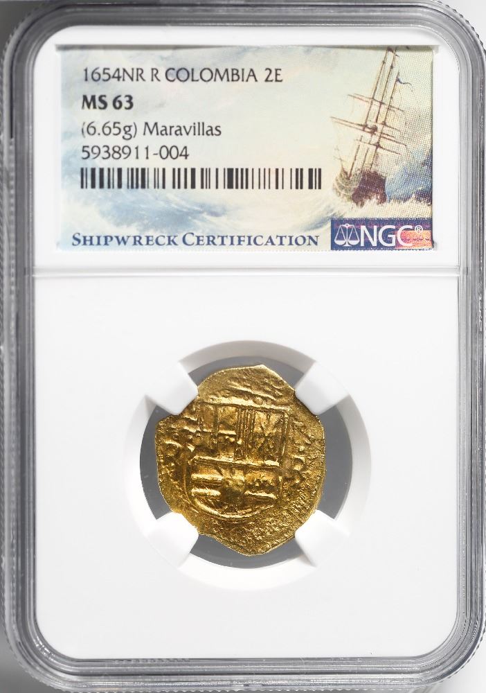 Bogota, Colombia, cob 2 escudos, (165)4R, mintmark NR to right, NGC MS 63 / Maravillas (special label). Restrepo-M50.23; S-B21; KM-4.1; Cal-1811. 6.65 grams. Very broad flan with choice full shield and cross-and-tressure, most of 4 of date visible, bold R's flanking shield, rather lustrous with faint traces of encrustation. NGC #5938911-004. From the Maravillas (1656).