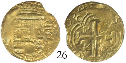 Bogota, Colombia, cob 2 escudos, 1654(R), encapsulated NGC AU-53, from the Maravillas (1656). S-B21; KM-4.1; CT-176. Bold 654 of date (scarce thus), with nearly full cross and shield, but very crudely struck on an uneven flan with voids and flat areas. From the Maravillas (as stated in the slab), sunk in 1656 off Grand Bahama Island.