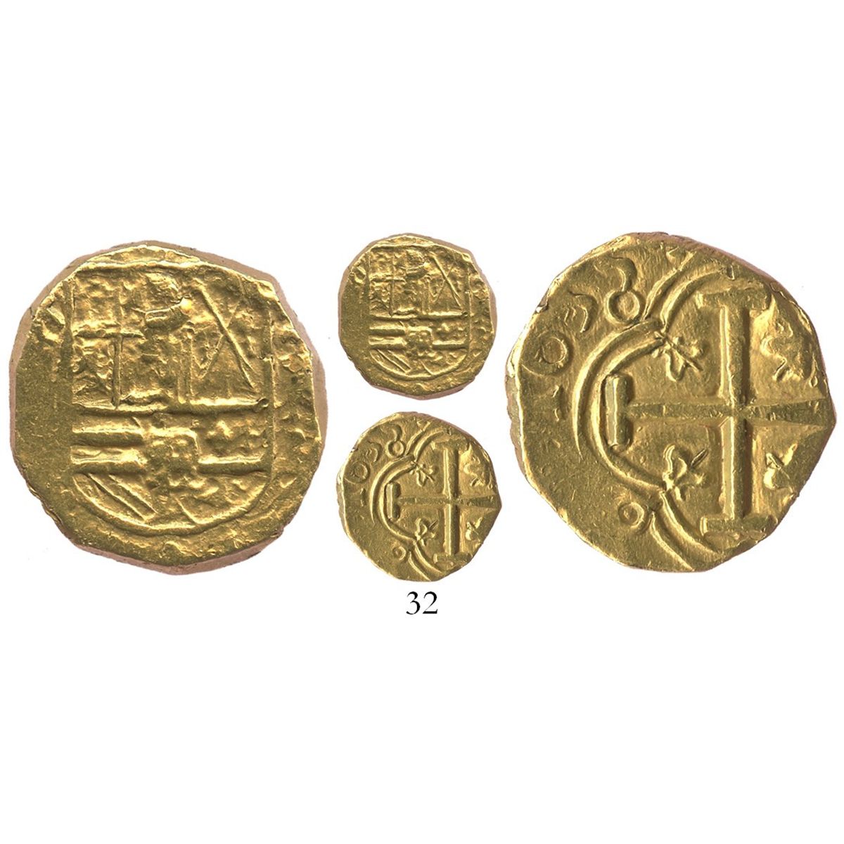 Bogota, Colombia, cob 2 escudos, 1655( R), rare, plate coin in The Practical Book of Cobs (4th ed). S-B21; KM-4.1; CT-unl. 6.7 grams. Very bold full date, choice full shield and cross (the latter off-center), XF+. Pedigreed to the Santa Fe Collection.