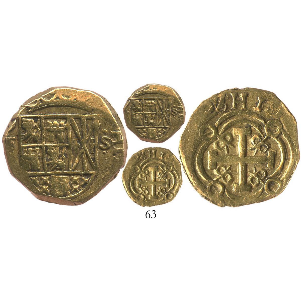 Bogota, Colombia, cob 2 escudos, (17)27/6S, unique. S-B25b; KM-unl (17.2); CT-unl. 6.8 grams. Exceptionally bold full shield and cross-and-tressure with very bold full 27/6 of date (only specimen we know of), F to left and S to right, deeply toned AXF. Pedigreed to the Santa Fe Collection.