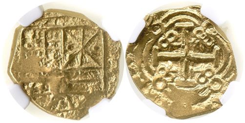Bogota, Colombia, cob 2 escudos, Charles II, 169(?), from the 1715 Fleet, encapsulated NGC AU 58. S-B24; KM-14.2. Full but partially flat shield, full and choice cross, much luster and good centering. From the 1715 Fleet.