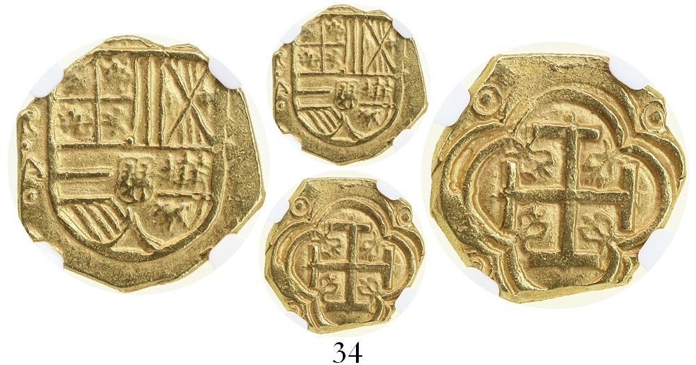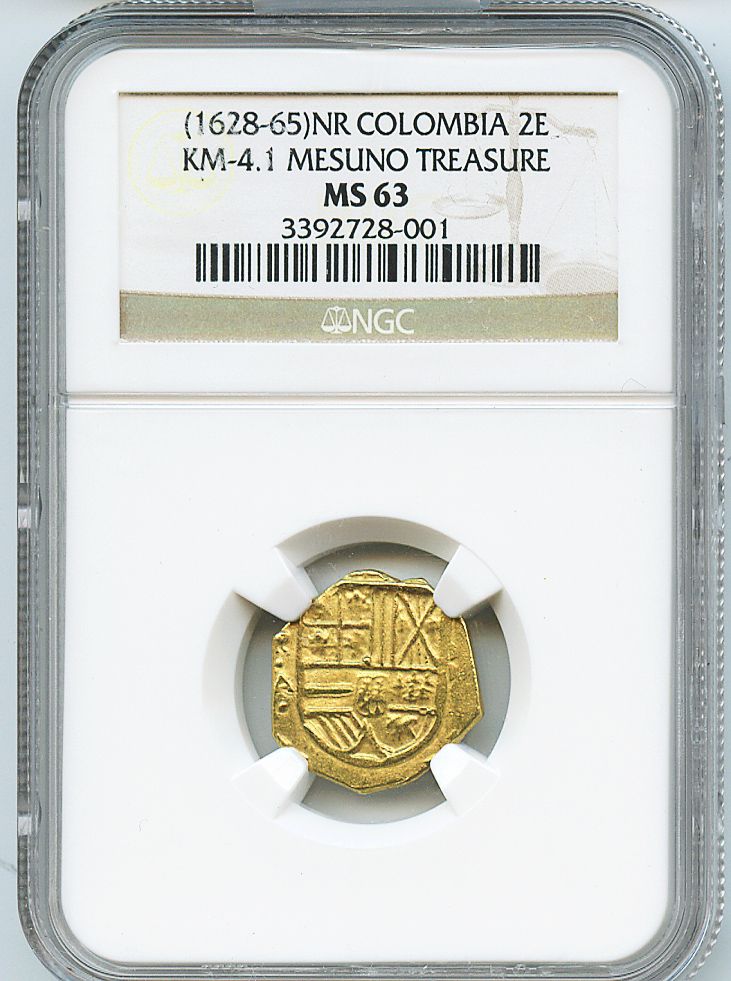 Bogota, Colombia, cob 2 escudos, Philip IV, assayer A to left below mintmark NR (ca. 1635), from the ca.-1636 "Mesuno hoard," encapsulated NGC MS 63. Restrepo-M50-13; S-B20; KM-4.1. Superb full shield and cross, clear assayer, much better strike and flan than usual. From the ca.-1636 "Mesuno hoard" (stated inside slab).