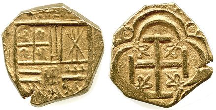 Bogota, Colombia, cob 2 escudos, Philip IV, assayer not visible (A below mintmark NR to left), ex-"Mesuno hoard" (ca. 1636). S-B20; KM-4.1. 6.7 grams. Small, thick flan with choice full cross, full shield, no peripheral detail but recognizable style and typically high grade (Mint State), tiny edge-split. From the "Mesuno hoard" (ca. 1636).