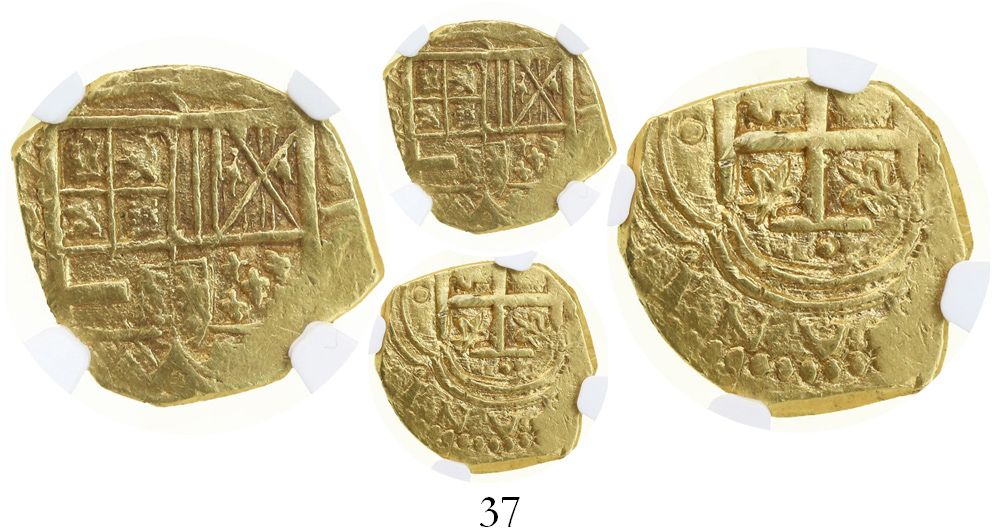 Bogota, Colombia, cob 2 escudos, Philip IV, assayer not visible (A), dots outside bars of cross (distinctive design of 1639[?]), second specimen known, encapsulated NGC AU 58. Restrepo-M50-19; S-B20; KM-4.1. 6.7 grams. Nice full shield but off-center cross, distinctive design that Restrepo attributes to 1639 without any specific proof, in any case clearly not in the range of 1667-93 as erroneously stated inside the slab.