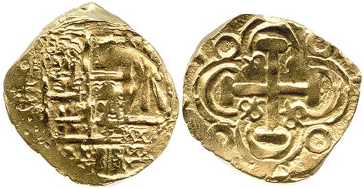 Bogota, Colombia, cob 2 escudos, posthumous Charles II, from the 1715 Fleet. S-B24; KM-17.1. 6.7 grams. Squarish flan with full but partially flat cross-and-tressure, full but doubled shield, lustrous but ex-jewelry (AU details). From the 1715 Fleet.