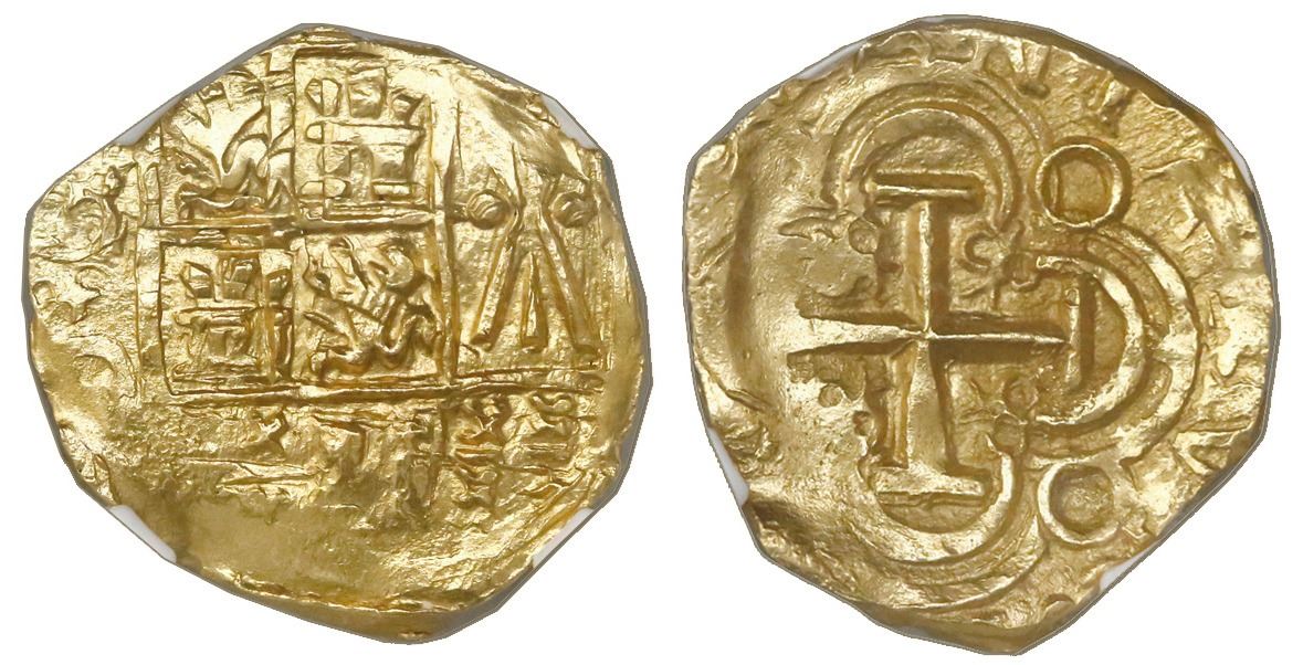 Bogota, Colombia, cob 2 escudos, posthumous Charles II, no assayer (Arce), NGC MS 64, ex-1715 Fleet (designated on label). Restrepo-M66.32; S-B24; KM-14.2. 6.85 grams. Broad flan with good full cross-and-tressure, full and well-detailed shield, nice luster. From the 1715 Fleet. NGC #4488735-005.
