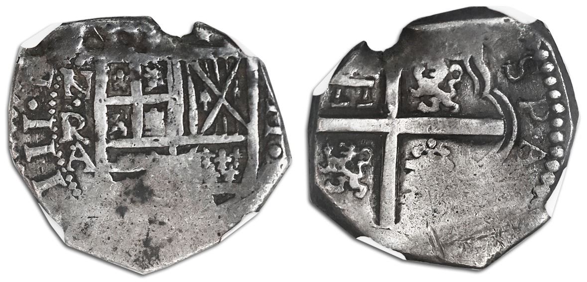 Bogota, Colombia, cob 2 reales, Philip IV, assayer A below mintmark NR to left (1632-42), castles and lions in proper quadrants on both sides, NGC VF 30. Restrepo-M28.15; S-B5; KM-6.1; Cal-939. 6.87 grams. Bold full dot-N-dot-R-dot-A between bold king's ordinal IIII and nearly full shield (weak at bottom), bold but incomplete cross (oversized on a small flan and slightly off-center), nicely toned, small part of edge crude (as made). NGC #4485805-025.
