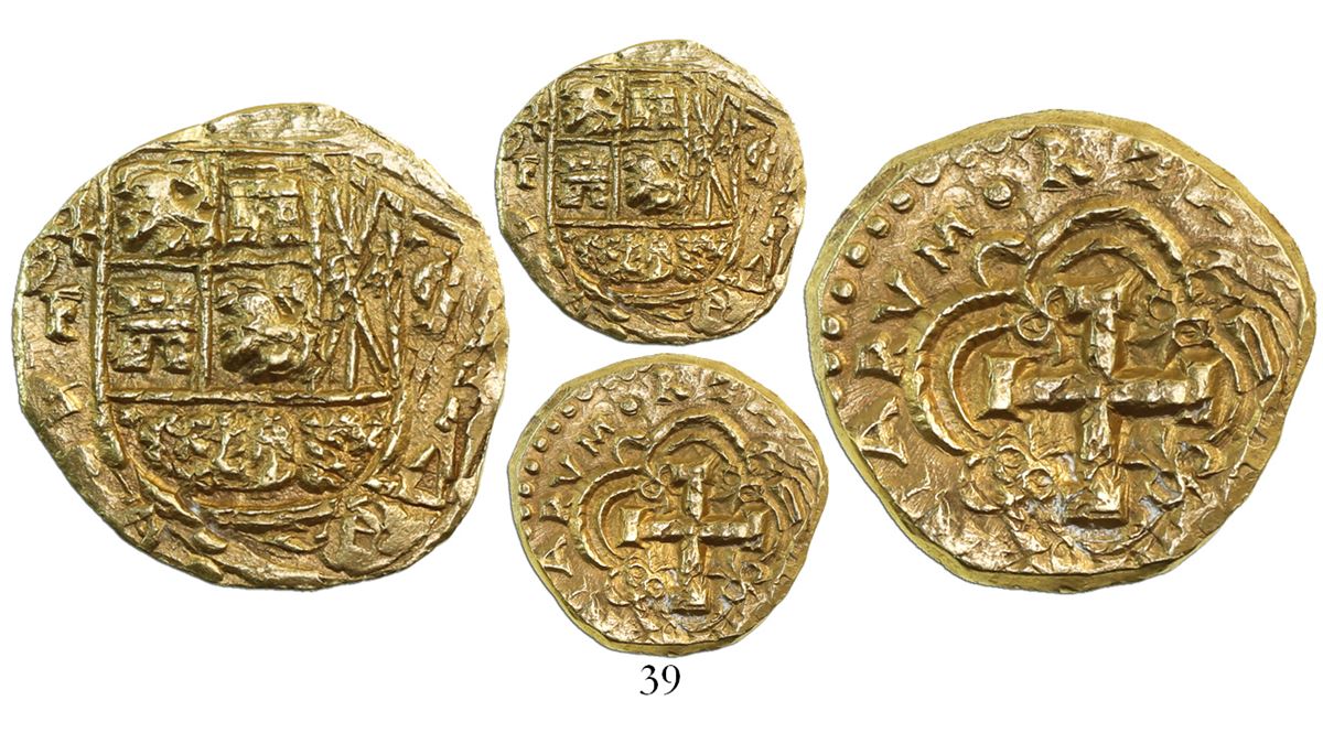 Bogota, Colombia, cob 4 escudos, Philip V, assayer S to right (style of 1744-6), mintmark F to left, ex-Lasser. Restrepo-M82.8; S-B27; KM-23. 13.22 grams. Bold Mint State with coral in crevices as from an unspecified wreck (probably a ca.-1744 wreck off Callao, Peru), full but slightly doubled shield and cross, bold mintmark F below denomination 4, broad flan, desirable pedigree. Pedigreed to the Joseph Lasser collection.