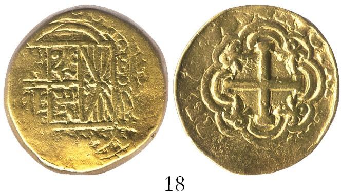 Bogota, Colombia, cob 8 escudos, 1750/49S. S-B27a; CT-53. 26.4 grams. Round, thick flan with bold full cross and tressure, nearly full but off-center shield, 8-dot-S to right, XF with light polishing and edge damage as formerly mounted in jewelry.