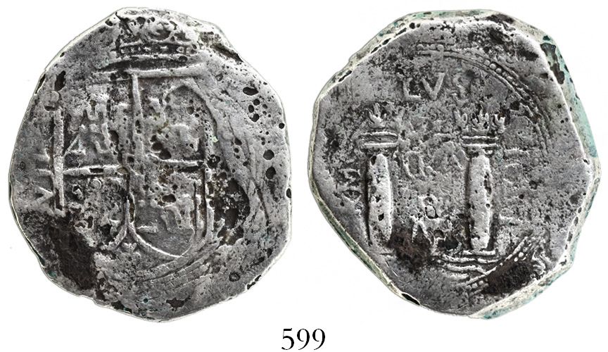 Bogota, Colombia, cob 8 reales, 1651, assayer PoRMS, rare (unique as from this wreck). S-B7. 26.16 grams. Solid coin with surface corrosion only, very bold pillars, full but doubled shield, interesting provenance for this type. Recovered from: Association, sunk in 1707 off the Scilly Isles, southwest of England