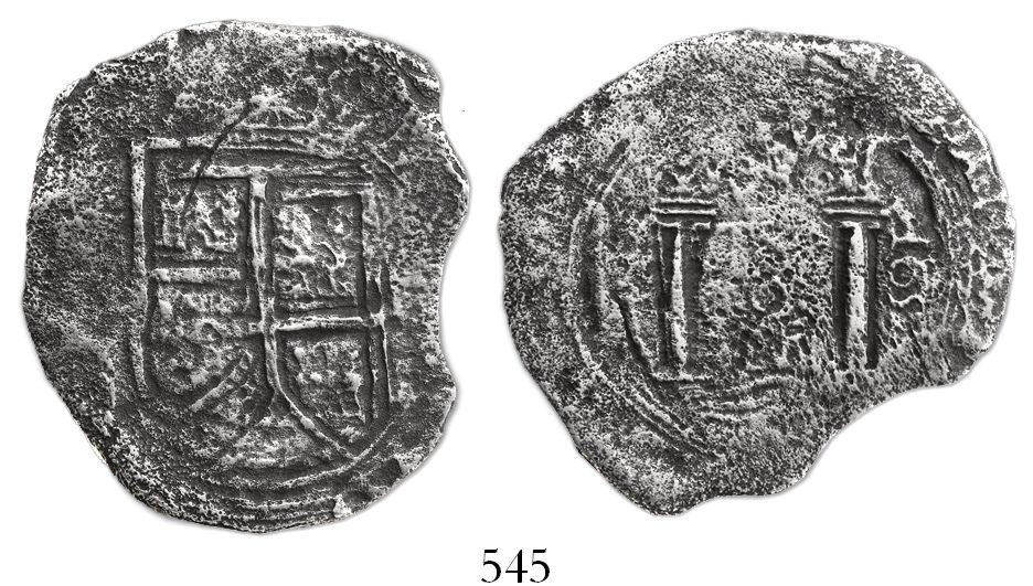 Bogota, Colombia, cob 8 reales, 1652(PoRAS or PoRMS), rare, ex-Haskins. Restrepo-M46 for type; S-B7; CT-Type 116. 16.51 grams. Bold full pillars with clear date, bold and full but double-struck shield, nicely toned but corroded all over. Pedigreed to the Jack Haskins collection, our Auction #10, with original lot-tag #394, with Sedwick photo-certificate. Recovered from: Maravillas, sunk in 1656 off Grand Bahama Island