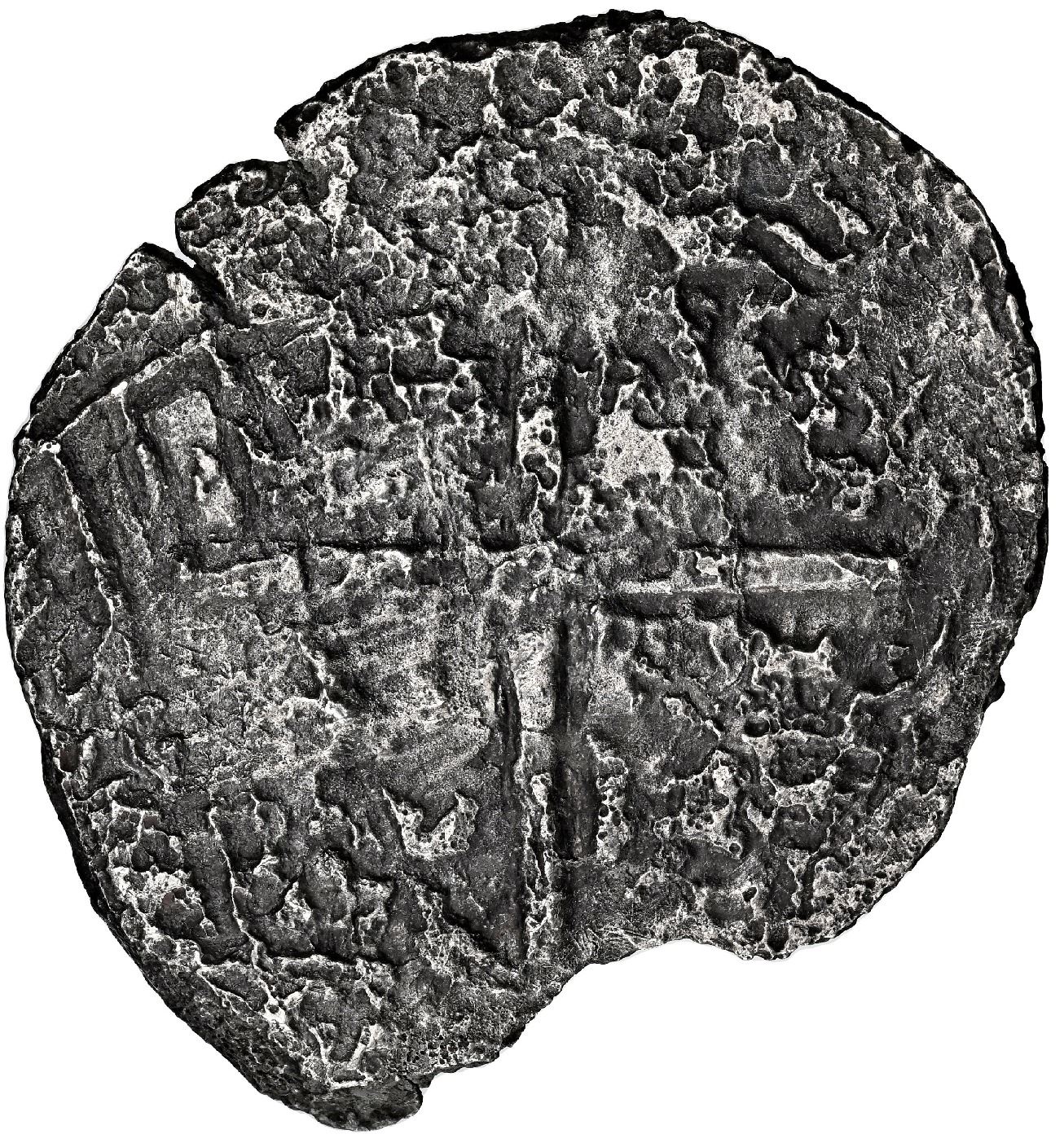 Bogota, Colombia, cob 8 reales, Philip IV, assayer A below mintmark NR to left, lions and castles transposed in shield and cross, flipover double-strike, NGC VF details / saltwater damage / Concepcion (Shipwreck Blue Label). Restrepo-M44.12; S-B5; KM-3.3; Cal-Type 337. 22.56 grams. Full assayer A (1632-42) to left of bold full shield struck over bold cross rotated 30 degrees, the actual cross side corroded but with trace of shield under full cross, deeply toned all over, a fascinating coin! Pedigreed to the Ponterio & Associates Inc auction of February 1993 (with original lot-tag 1924) as well as the Henry Christensen auction of May 1982 (with original lot-tag 981132), and to the 45th Anniversary Collection, with original tag 407 and official (generic) Letter of Authenticity. Recovered from: Concepcion, sunk in 1641 off Hispaniola