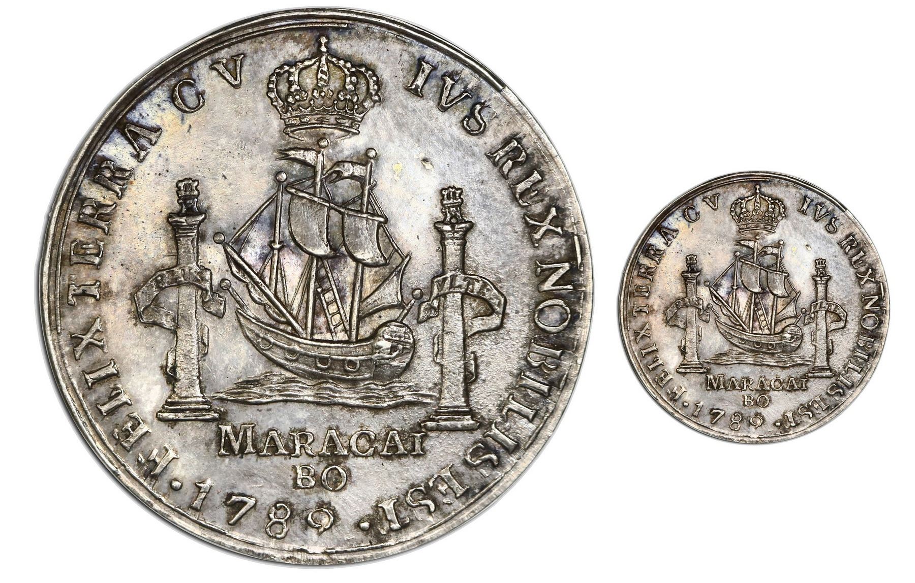 Bogota, Colombia (for Maracaibo, Venezuela), silver uniface 4R-sized proclamation medal die trial, Charles IV, 1789, very rare. Herrera-157; Medina-181. 32mm; 18.04 grams. Design of a ship below crown between Pillars of Hercules above MARACAI / BO within legend FELIX TERRA C V IVS REX NOBILIS EST with date .1789. at bottom. Choice AU+ with light rainbow toning over luster, the blank other side smooth and clean (the obverse of full medal showing bust of Charles III [sic], like the next few lots, yet this trial strike is smaller in diameter), only the second specimen we can trace and significantly absent in Restrepo. Pedigreed to the Santander Collection. The Santander Collection of Colombian Proclamation Medals
