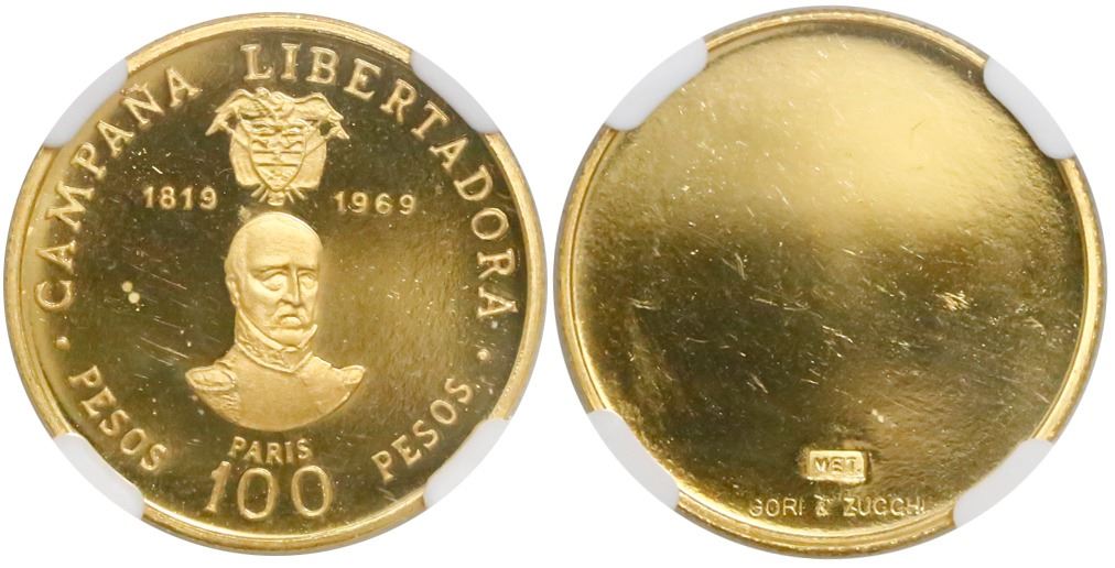 Bogota, Colombia, gilt brass reverse trial, proof 100 pesos, 1969, Liberation Campaign (Battle of Bo