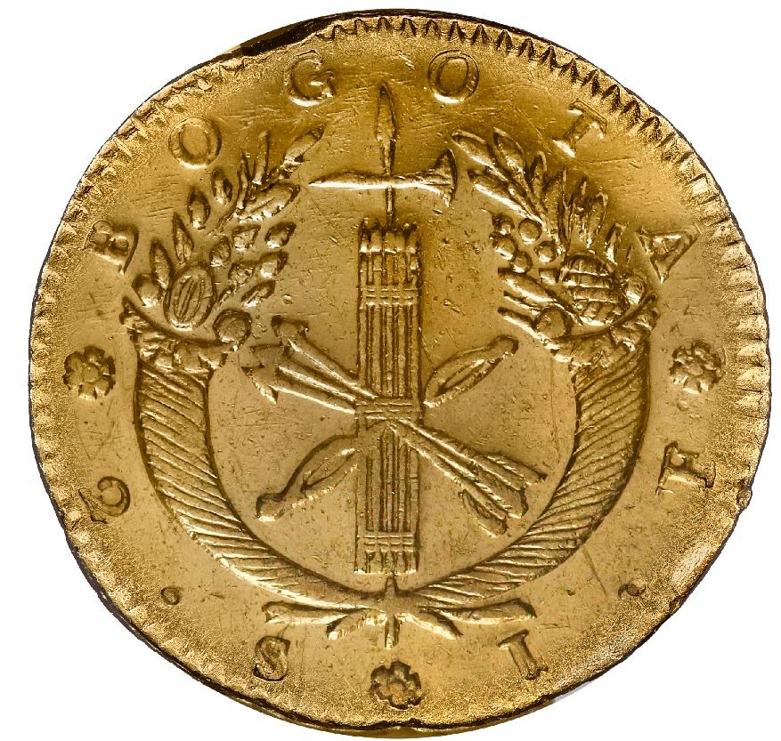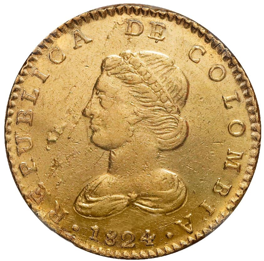 Bogota, Colombia, gold 2 escudos, 1824JF, rare, NGC XF 45 / SS New York (1846).