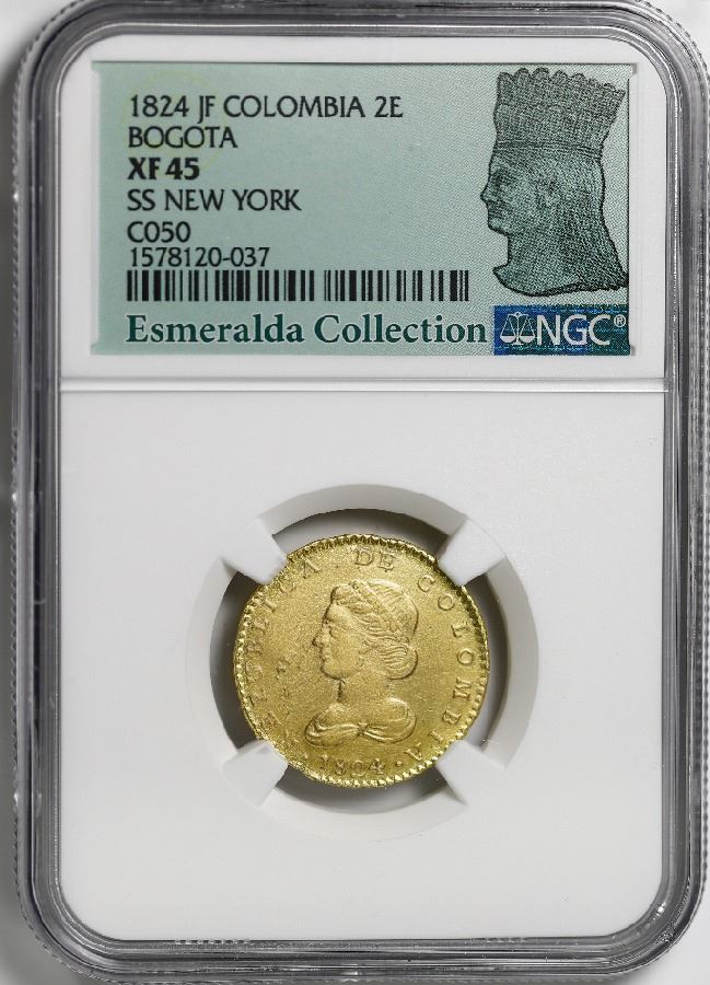 Bogota, Colombia, gold 2 escudos, 1824JF, rare, NGC XF 45 / SS New York (1846). Sed-4; Restrepo-163.3; KM-83. While not as rare as the one-year 4E, the five-year 2E series is similarly demanding and rarely encountered, all its dates (only 1824, 1825, 1826, 1829 and 1836 confirmed) rare and "underrated" (according to Sedwick, who rates all the dates as RR), this example better than average and additionally desirable for its shipwreck provenance, with nice luster in bright yellow color, minor laminations on obverse. NGC #1578120-037. Pedigreed to the Esmeralda Collection (stated on special label) and from the SS New York (1846).