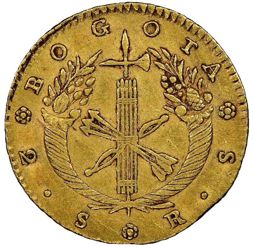 Bogota, Colombia, gold 2 escudos, 1829RS, rare, NGC AU 50, finest known, ex-Eldorado. Sed-4; Restrepo-163.9; KM-83. Bold strike with contrasting sediment around details, nice light toning all over, part of reverse rim weak (as made), finest-known example of an elusive, brief type, way finer than the only other NGC entry at VG and missing in the PCGS census (except for this very coin, now crossed over). NGC #5936656-008. Pedigreed to the Esmeralda Collection (stated on special label) and to the Eldorado Collection (Stack's Bowers auction of August 2018, lot 40377).
