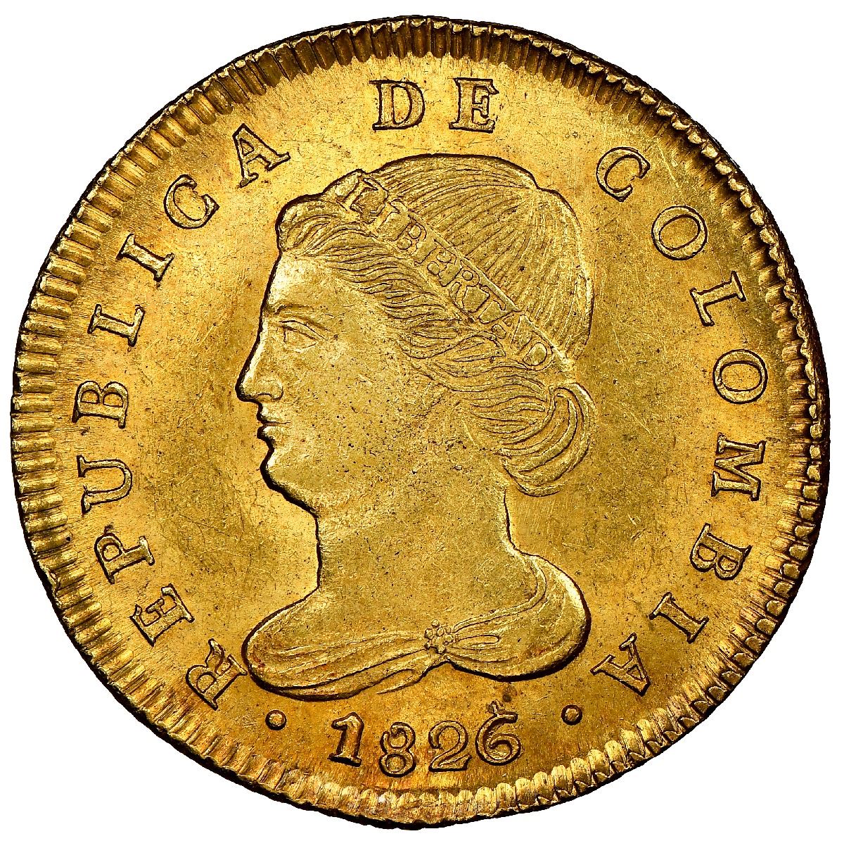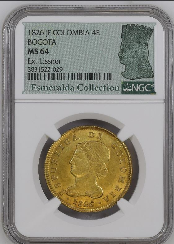 Bogota, Colombia, gold 4 escudos, 1826JF, very rare, NGC MS 64, finest known, ex-Eliasberg, ex-Lissner (stated on label). Sed-5; Restrepo-164.1; KM-86. A very important and highly sought one-year issue, in fact the only 4E issue of the Republic of Colombia, this example famous for its long pedigree and exceptional grade, the next highest (currently) being a distant XF 45, deeply gold-toned over luster and bold strike and rims, no marks or wear, an absolute gem with no equal. NGC #3831522-029. Pedigreed to the Esmeralda Collection (stated on special label) and to the R.L. Lissner Collection (St. James's / CNG / Teller auction of August 2014, lot 1444) and to the Eliasberg Collection (ANR auction of April 2005, lot 1568).