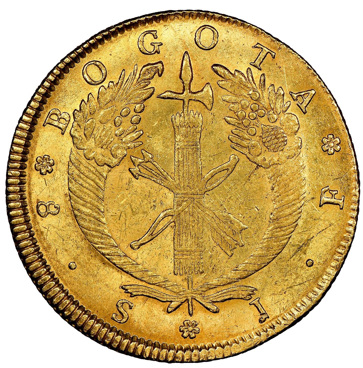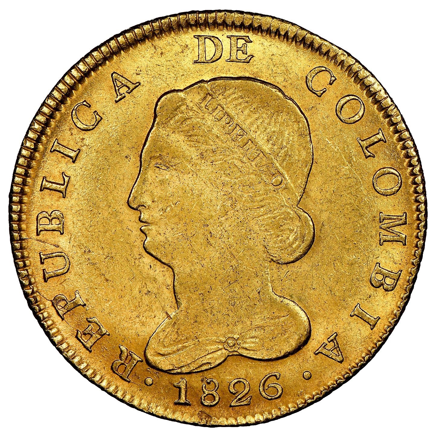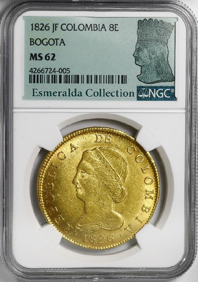 Bogota, Colombia, gold 8 escudos, 1826JF, NGC MS 62. Sed-6; Restrepo-165.9; KM-82.1. Nice luster and good rims, hint of toning, minimal small marks, tied with one other at MS 62 behind a single MS 62+ in the NGC census. NGC #4266724-005. Pedigreed to the Esmeralda Collection (stated on special label).