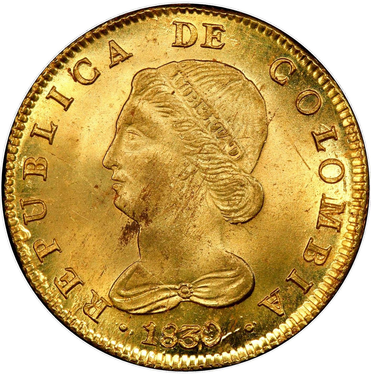Bogota, Colombia, gold 8 escudos, 1830 R.S, PCGS MS63.