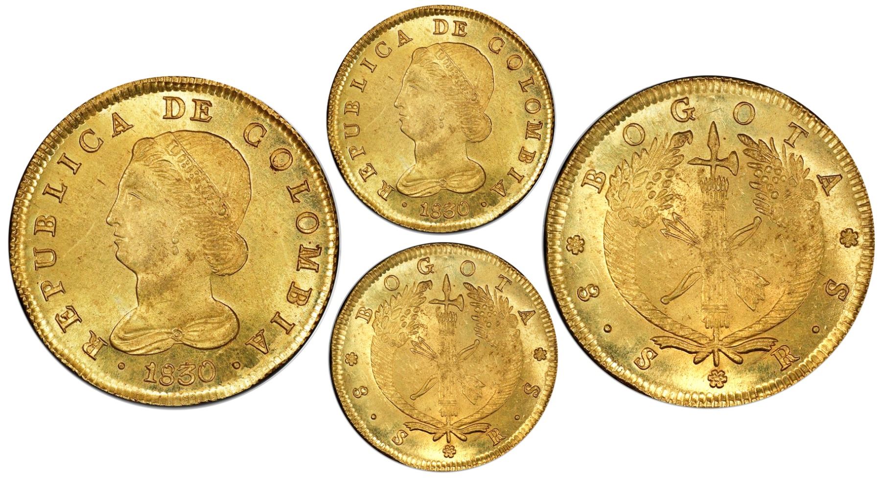 Bogota, Colombia, gold 8 escudos, 1830RS, PCGS MS63. Restrepo-165.19; Sed-6; KM-82.1. Choice luster and strike, with no wear at all and only trivial marks in fields, tied with two others for second finest in PCGS census behind a single MS64 (with one other at that same grade at NGC). PCGS #37311553.