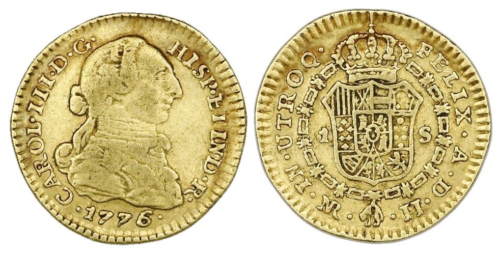 Bogota, Colombia, gold bust 1 escudo, Charles III, 1776/5JJ, rare. Restrepo-52.11; KM-48.1; Cal-1455. 3.33 grams. XF with red toning in legends, no problems, popular date for US collectors.