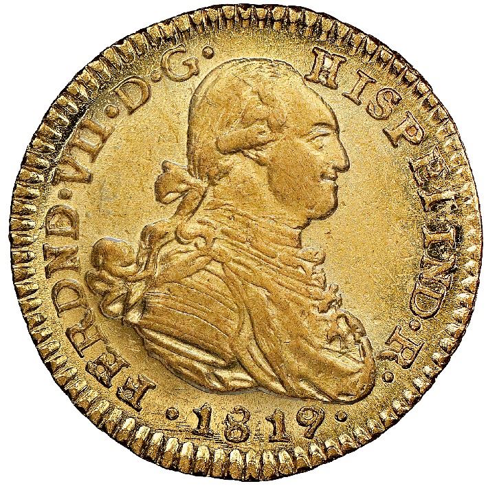 Bogota, Colombia, gold bust 1 escudo, Ferdinand VII (bust of Charles IV), 1819JF, NGC MS 62, finest known in NGC census. Restrepo-122.25; KM-64.1; Cal-1558. Choice strike with strong luster, slight central weakness, practically no marks or wear, exceptional grade for this type. NGC #3908143-005. Pedigreed to the Esmeralda Collection (stated on special label).