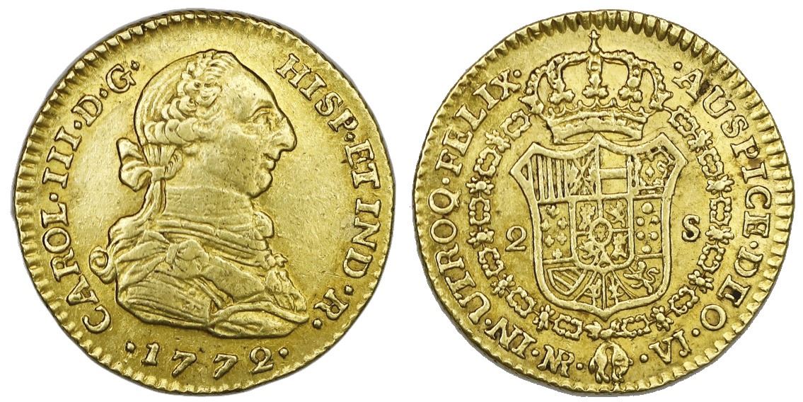 Bogota, Colombia, gold bust 2 escudos, Charles III, 1772VJ. Restrepo-61.1; KM-49.1; Cal-1685. 6.74 grams. Bold strike with nice luster, slightly off-center obverse, AU+ with faint surface hairlines, first date of type.