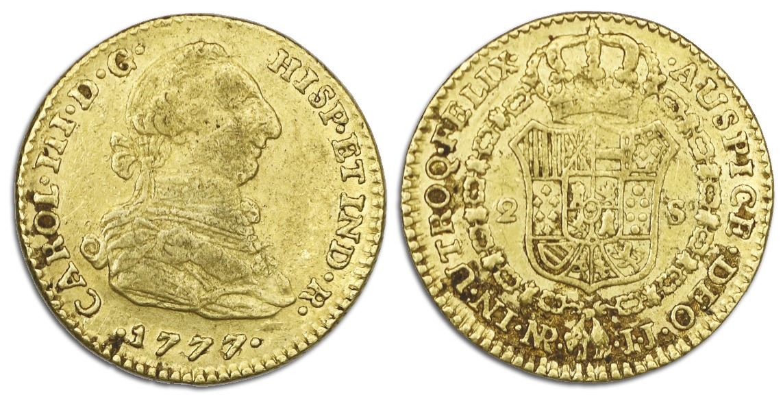 Bogota, Colombia, gold bust 2 escudos, Charles III, 1777/6JJ. Restrepo-61.12; KM-49.1; Cal-1694. 6.70 grams. AU with encrustation in crevices as from salvage, traces of luster.