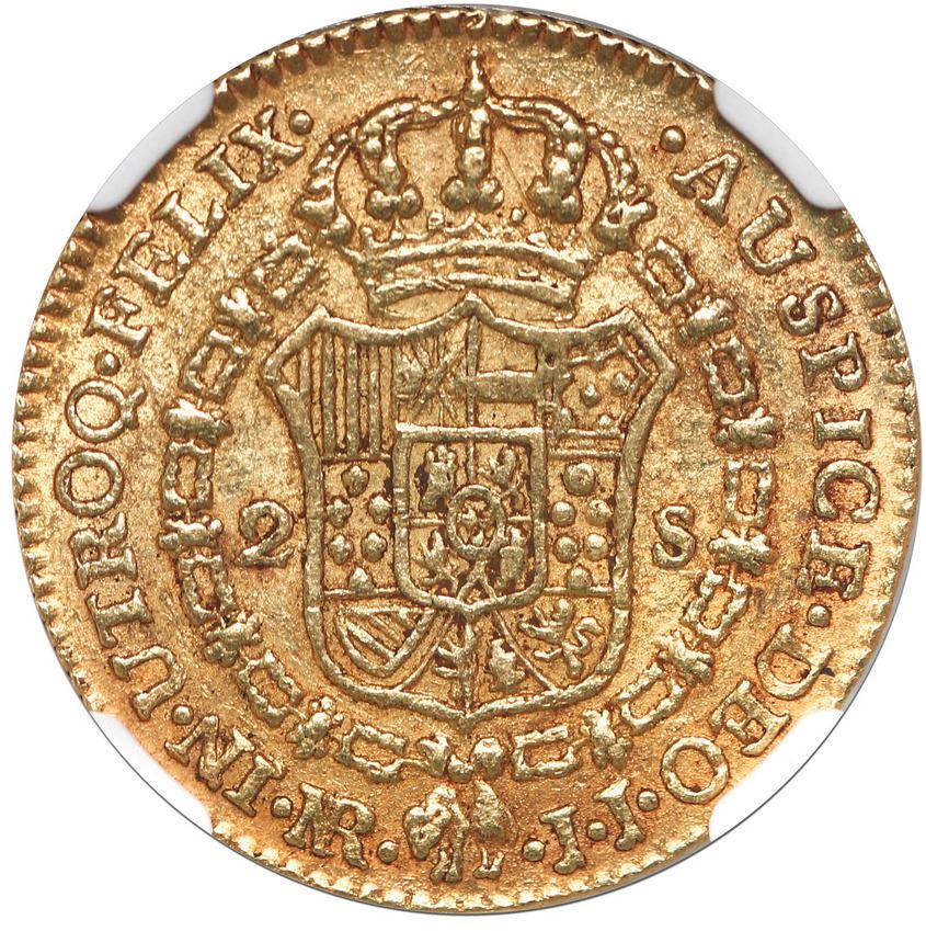 Bogota, Colombia, gold bust 2 escudos, Charles III, 1788 J.J, NGC AU 55. Restrepo-61.37; KM-49.1a; Cal-1716. Bold strike, hint of luster and toning, slight die-rust on reverse, second finest in NGC census behind a single MS 63. NGC #6445257-002.