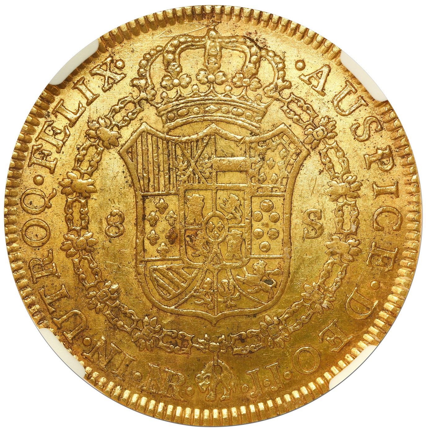 Bogota, Colombia, gold bust 8 escudos, Charles III, 1785 J.J, NGC AU 58.