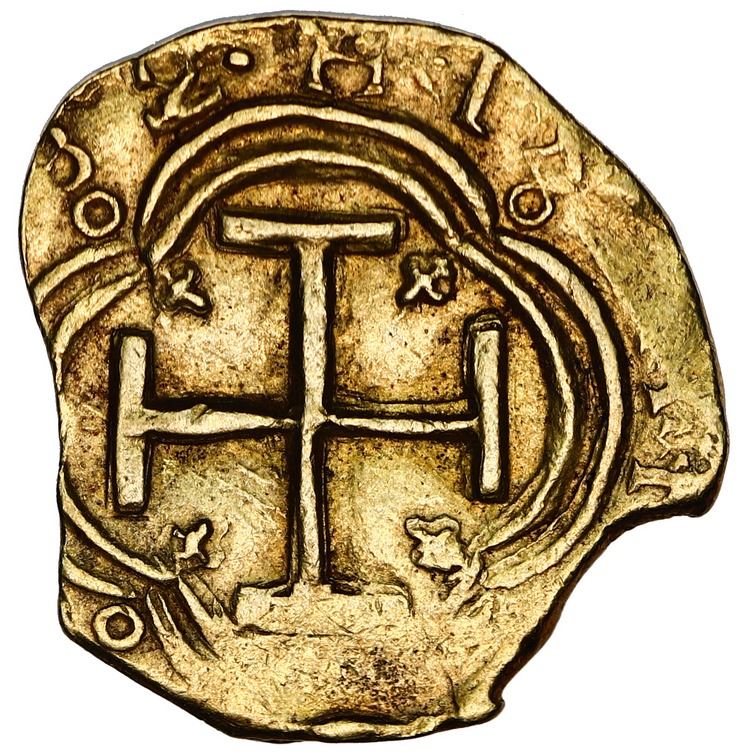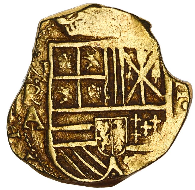 Bogota, Colombia, gold cob 2 escudos, 1632 A, very rare, ex-Santa Fe, ex-Caballero, Calico Plate, Restrepo Plate. Restrepo-M50.9; S-B20; KM-unl; Cal-1789. 6.71 grams. A somewhat famous coin, featured in published collections and references as the only dated specimen known of its type for this assayer (tiny fleurs, thin cross), with full NR-A to left and clear denomination II (reading vertically) to right, choice full shield and cross, slightly odd shape that serendipitously allows for a full and clear 32 of date, the 2 being punched over something else but decidedly not an upside-down 2 as asserted in Restrepo, AU- with contrasting sediment in crevices. Pedigreed to the Santa Fe Collection (Sedwick Auction of October 2011, lot 21) and the Caballero de Yndias Collection (Aureo and Calico auction of April 2009, lot 118), also Plate Coin on page 300 of the 8th edition of Calico's Numismatica espanola, and on page 85 of Restrepo's Coins of Colombia (4th ed., 2012).