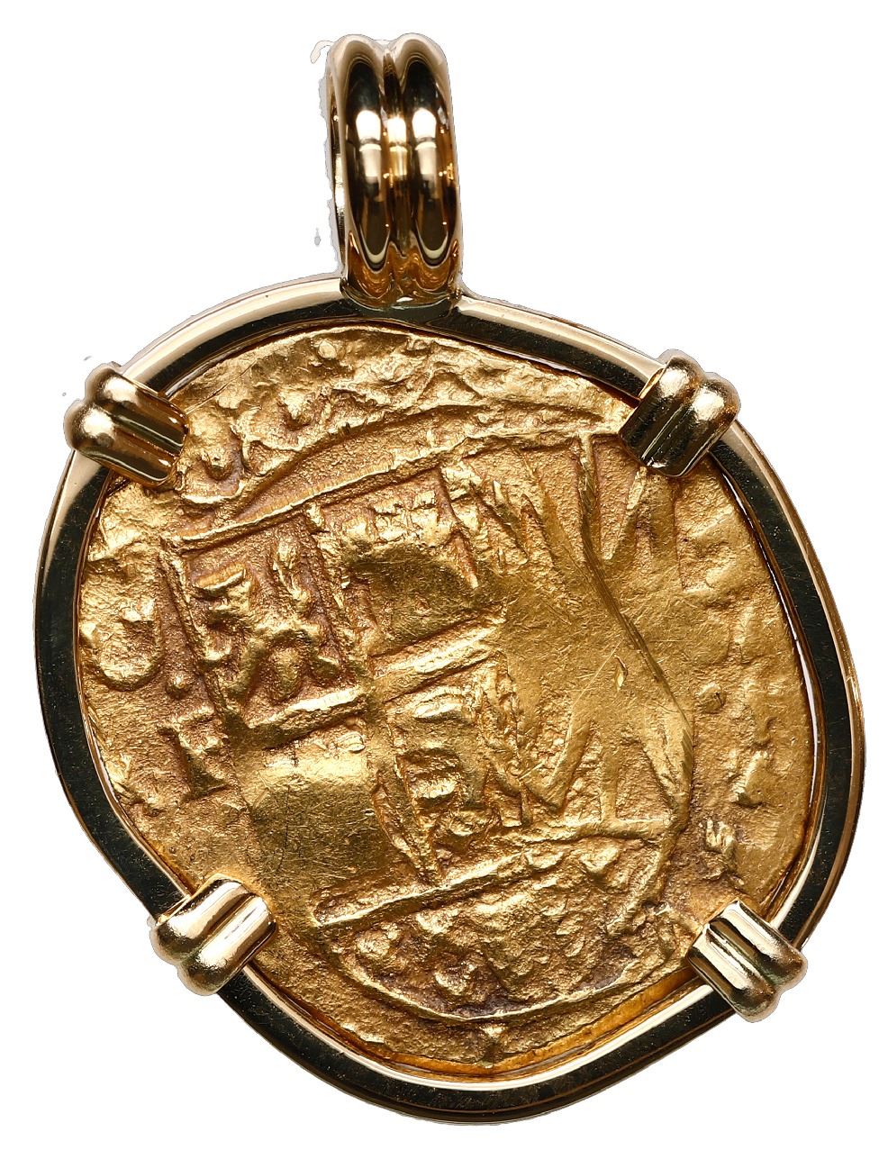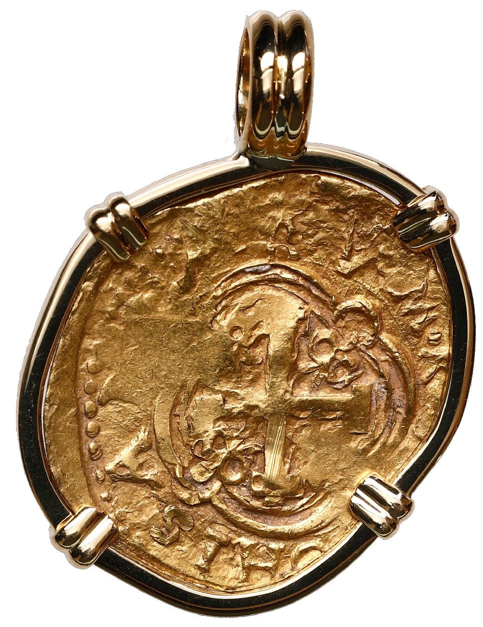 Bogota, Colombia, gold cob 2 escudos, 1720, assayer S to right, mintmark F to left, mounted cross-side out in 18K gold bezel with fixed bail. 10.88 grams total. Mint State with some scuffs on the high points, light encrustation around the cross, sharply struck and nearly complete shield and cross with plentiful legend detail.