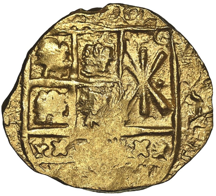 Bogota, Colombia, gold cob 2 escudos, Charles II posthumous, 1703, assayer ARCE, rare, NGC MS 63, ex-1715 Fleet (designated on label). Restrepo-unl (cf M66.32); S-B24; KM-14.2; Cal-unl. 6.75 grams. Full shield and cross (both with one flat spot), somewhat lustrous, with clear (AR)CE 170 and bottom of 3 of date in legend, a recently discovered one-year type that was unknown to Restrepo and has yet to be listed by NGC, whose label and census erroneously attribute this coin to Philip V (1714-16) anyway. NGC #4278331-001. From the 1715 Fleet, with original Cobb Coin Co. (Mel Fisher) tags #NCB3017MO.