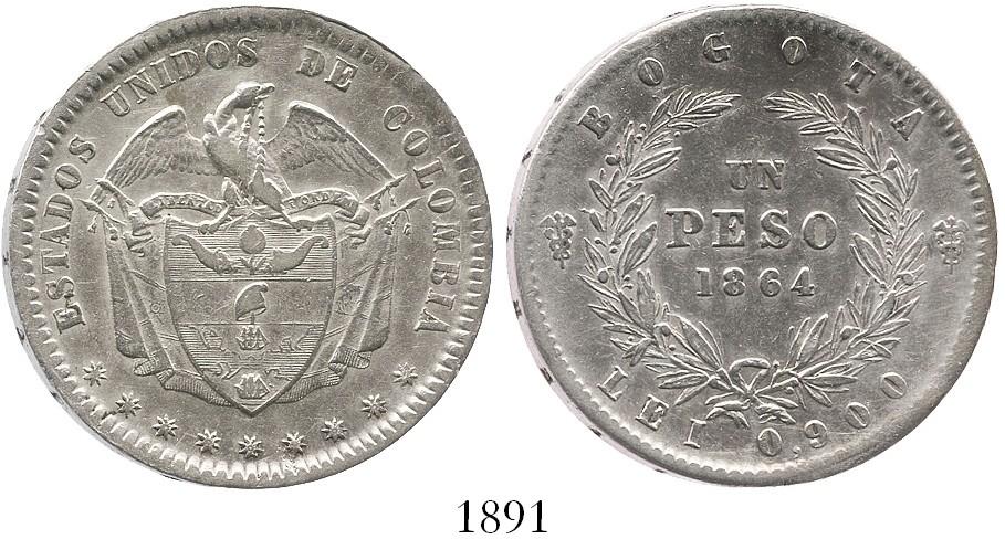 Bogota, Colombia, peso, 1864. R-315.3; KM-139.1. 24.9 grams. AXF, lustrous from light cleaning, slightly crude rims (as made). Pedigreed to the Norweb and Herman Blanton collections.
