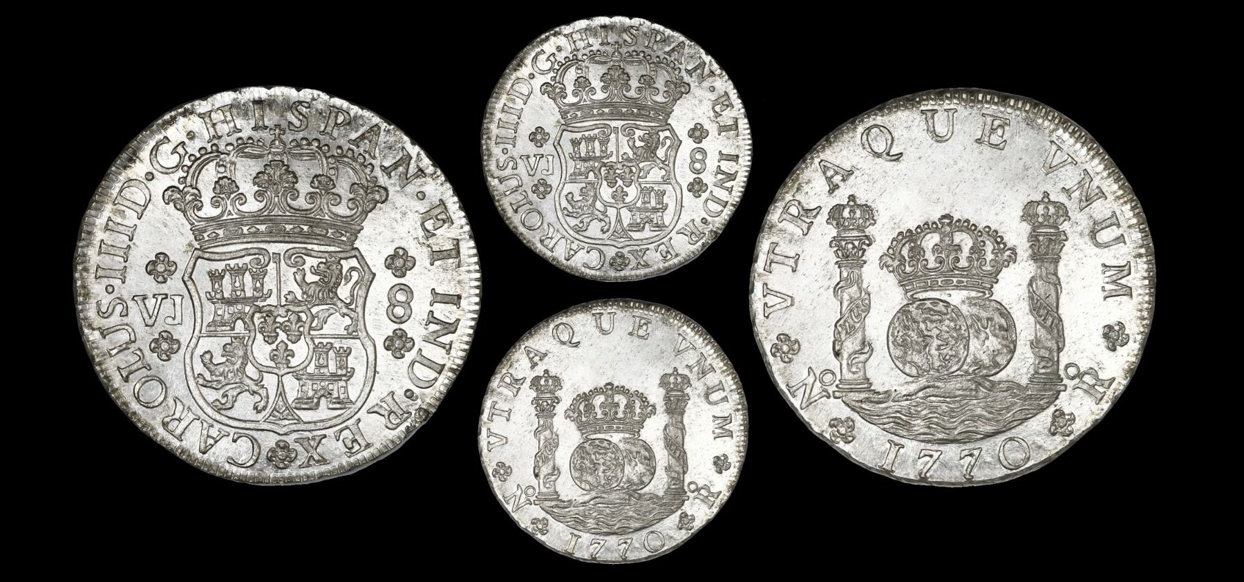 Bogota, Colombia, pillar 8 reales, Charles III, 1770VJ, very rare, PCGS MS65, finest graded in both