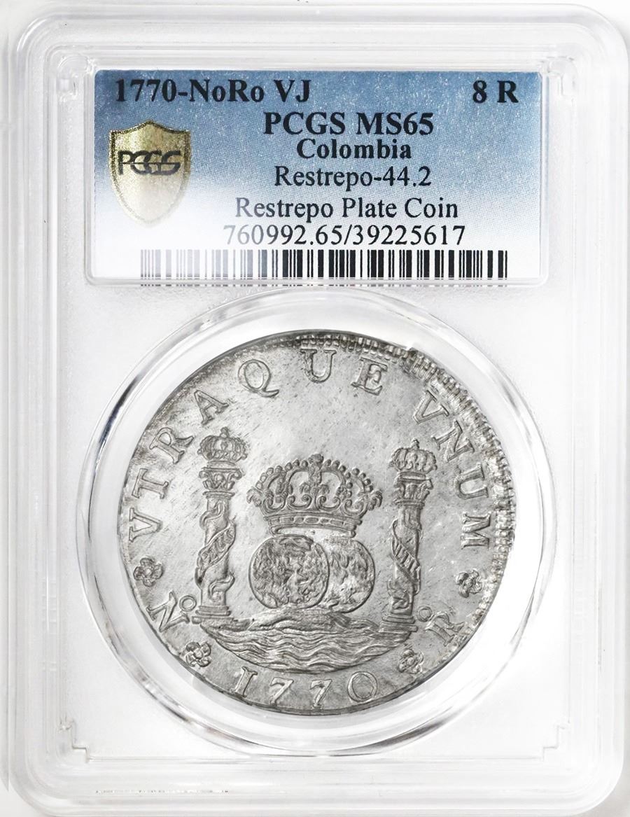 Bogota, Colombia, pillar 8 reales, Charles III, 1770VJ, very rare, PCGS MS65, finest graded in both censuses, Restrepo Plate Coin (stated on label). Yonaka-B8-70; Restrepo-44.2; KM-39; Cal-1199. Truly prooflike with bright, mirrorlike luster on fields and frosty, totally unblemished details, mostly sharp rims, very choice by anyone's estimation but notably the only MS65 over a handful of choice MS62-MS64 pieces at NGC (and a single MS64 at PCGS), all from the same group discovered in Bogota in the area of the foundation of the forgotten former location of the Nuestra Señora del Pilar convent, for whose dedication in 1770 these pillar dollars were supposedly specially struck (see our Auction 16, lot 752 for long explanation). PCGS #39225617. Pedigreed to the Nueva Granada Collection (stated on label), and Plate Coin on page 114