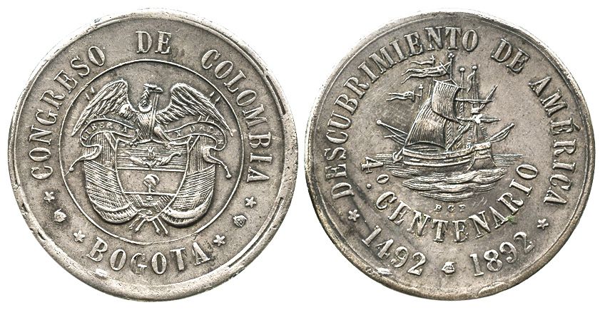 Bogota, Colombia, silver medal, 1892, 400th anniversary of the discovery of the Americas, rare. Restrepo-unl. 34.5mm; 20.4 grams. Obverse with arms and legend CONGRESO DE COLOMBIA / BOGOTA; reverse with sailing ship inside legend DESCUBRIMIENTO DE AMERICA / 4o CENTENARIO / 1492 * 1892. Attractively toned XF+ with crude rims (as made), apparently rare as not mentioned in Restrepo.