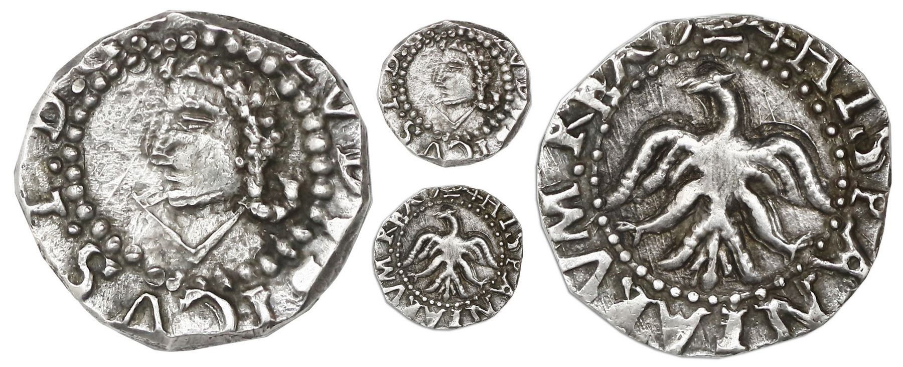 Bogota, Colombia, silver proclamation medal, Louis I, 1724, very rare, NGC AU 58, finest and only example in NGC census. Restrepo-p. 100; Medina-11; Betts-154. 8mm; 3.34 grams. Obverse with left-facing bust of king within legend LVDVSICVS [sic] I D G; reverse with eagle with wings spread (arms of the city of Santa Fe de Bogota) inside legend HISPANIARVM REX .724. This piece has significance on many levels: First, it is considered the first proclamation medal struck in Colombia; second, it is one of the first hand-struck (as opposed to cast) medals of the Americas; and (above all) it is so rare that only three examples are known, the others (both plated in Restrepo) being the John Adams specimen sold by Stack's Bowers in 2015 and the Vidal Quadras y Ramon specimen (published with illustration by Medina in 1917 and clearly the same piece described by Betts in 1894). The present specimen, the only one of the three certified and graded, exhibits lovely contrasting toning on virtually as-struck surfaces, with the interior details very bold and most of the legends clear, quite reminiscent of silver cobs being made at the time. For comparison, the Adams specimen, which was holed, sold for $4500 plus the buyer's fee in 2015. Pedigreed to the Santander Collection (stated on label). NGC #4743181-006. The Santander Collection of Colombian Proclamation Medals