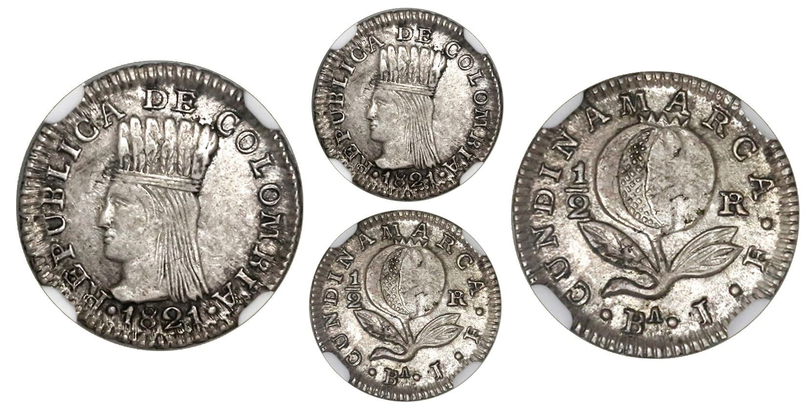 Bogota (Cundinamarca), Colombia, 1/2 real, 1821JF, NGC AU 58. Restrepo-149.1; KM-F8. Choice strike and grade (actually Mint State in our opinion), with all details visible and no marks or wear, muted luster, light toning around details. NGC #4700529-004.