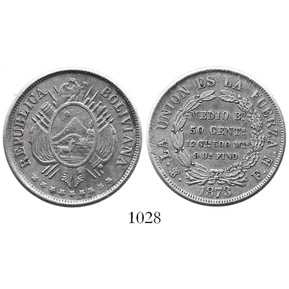 Bolivia, 50 centavos, 1873FE, "12 Gms 500 Mms" error, rare.