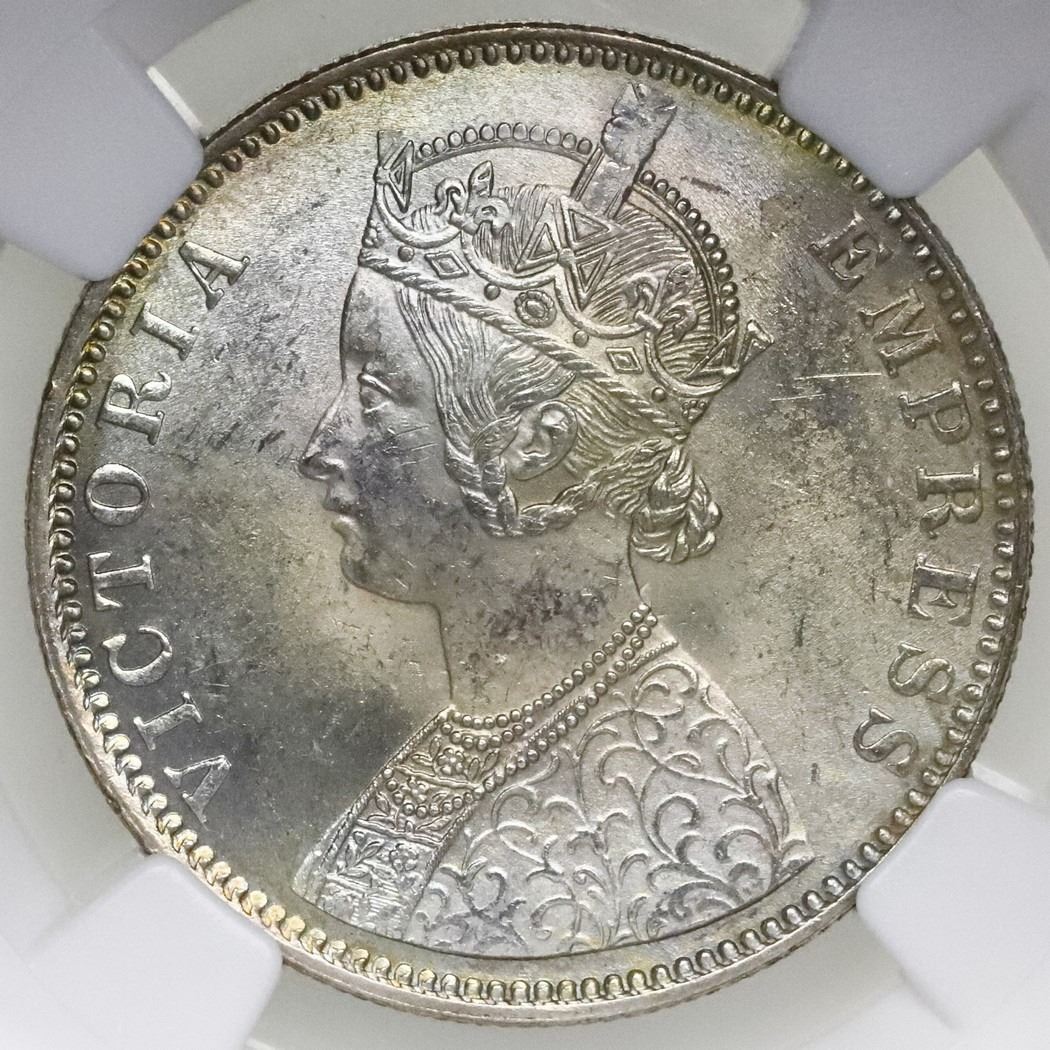 Bombay, British (India), rupee, Victoria, 1886-B, NGC MS 63. SW-6.93; KM-492. Bold design details from a strong strike, faint colorful toning over flashy surfaces, perhaps a bit conservatively graded. NGC #5907479-003.