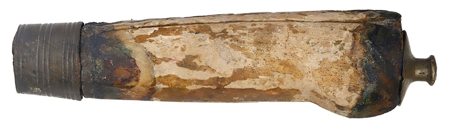 Bone and brass knife handle, ex-Guadalupe-Tolosa (1724). 58 grams. 4" long. The blade long gone, what remains is a tapered, octagonal bone handle with round brass attachment with ring-turned embellishments on one side (for the blade) and brass end-cap on the other. From the Guadalupe-Tolosa (1724), with original certificate from Captain Tracy Bowden through his contract with the Dominican Republic and copy of the article "Graveyard of the Quicksilver Galleons" by Mendel Peterson from the December 1979 issue of National Geographic.