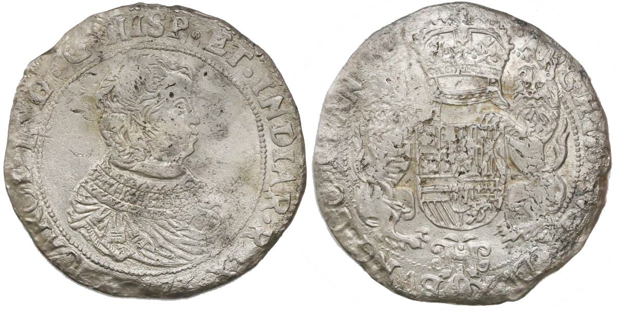 Brabant, Spanish Netherlands (Antwerp mint), portrait ducatoon, Charles II, 1673. Delmonte-325; KM-79.1. 26.56 grams AU details with luster on fields but corroded on edge (only), all legend readable and with fully detailed portrait (very rare thus), silvery. Recovered from: Slot ter Hooge, sunk in 1724 off Porto Santo, Madeira Islands