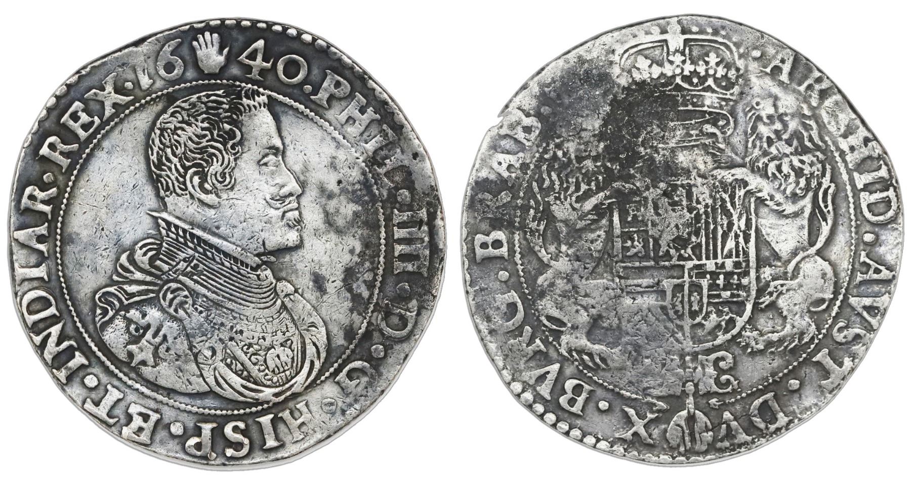 Brabant, Spanish Netherlands (Antwerp mint), portrait ducatoon, Philip IV, 1640. Dav-4454; KM-72.1. 32.32 grams. Superb specimen with details (legends and interiors) in near-AU grade, deeply toned, with just a couple spots of localized corrosion. Recovered from: Slot ter Hooge, sunk in 1724 off Porto Santo, Madeira Islands