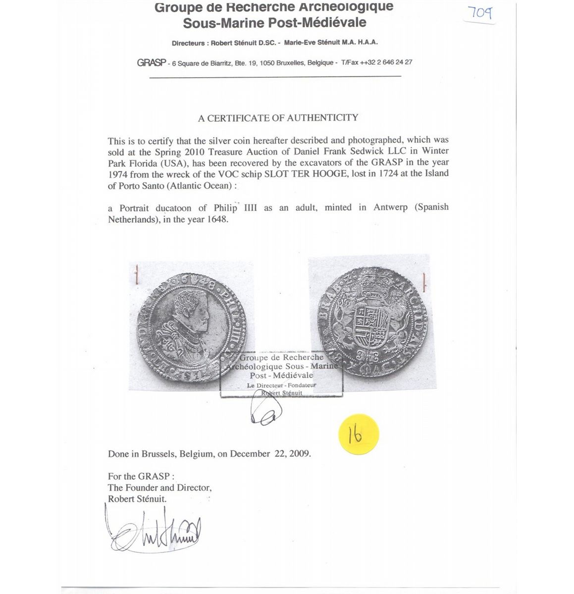 Brabant, Spanish Netherlands (Antwerp mint), portrait ducatoon, Philip IV, 1648. KM-72.1. 32.0 grams. Huge flan with 100% full and bold details, the date and portrait and king's ordinal especially prominent, nicely toned, surely among the best specimens from this or any other wreck. Pedigreed to our Auction #7, with lot-tag #568 and certificate from the salvager (Stenuit). Recovered from: Slot ter Hooge, sunk in 1724 off the Madeira Islands, northwest of Africa